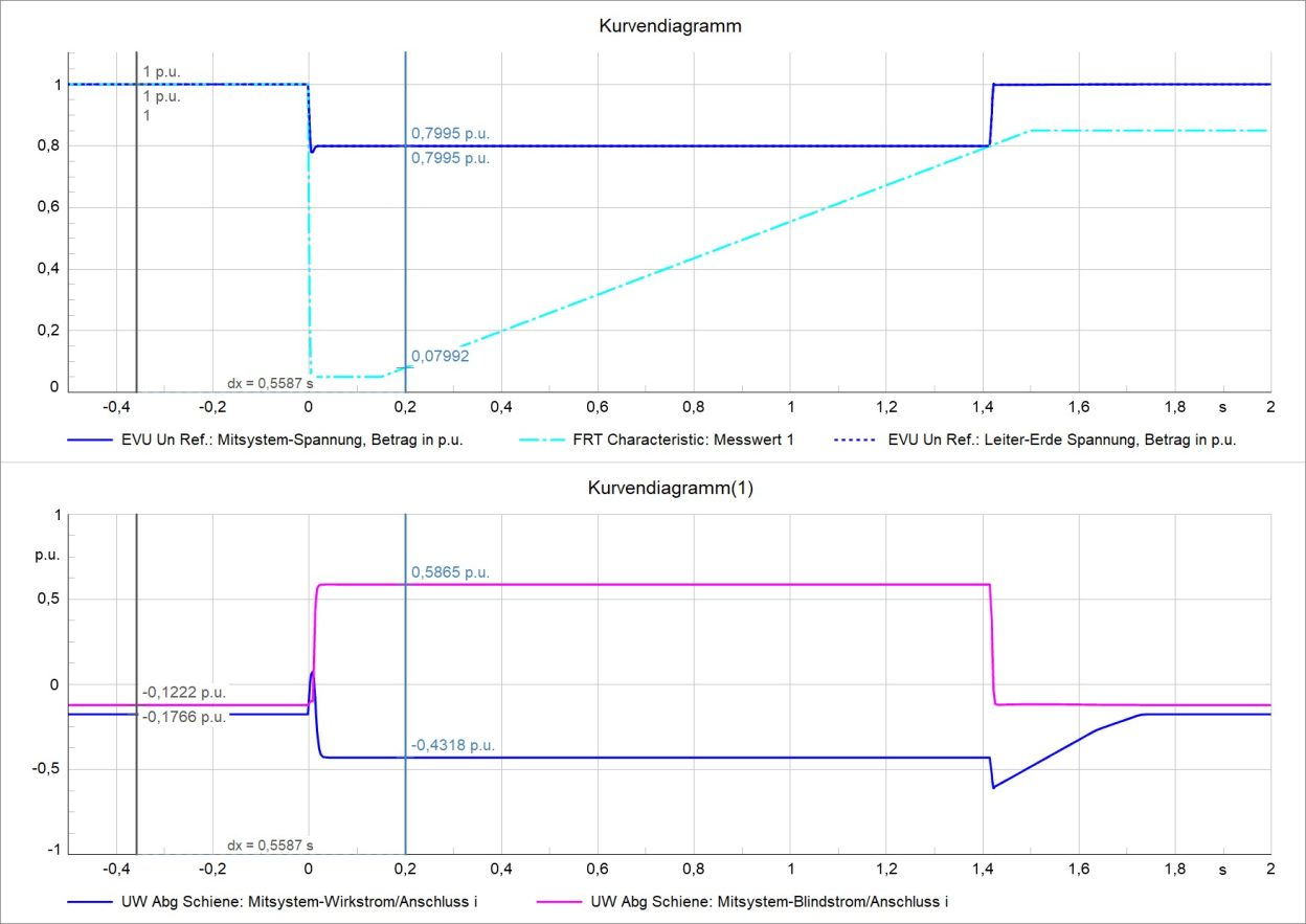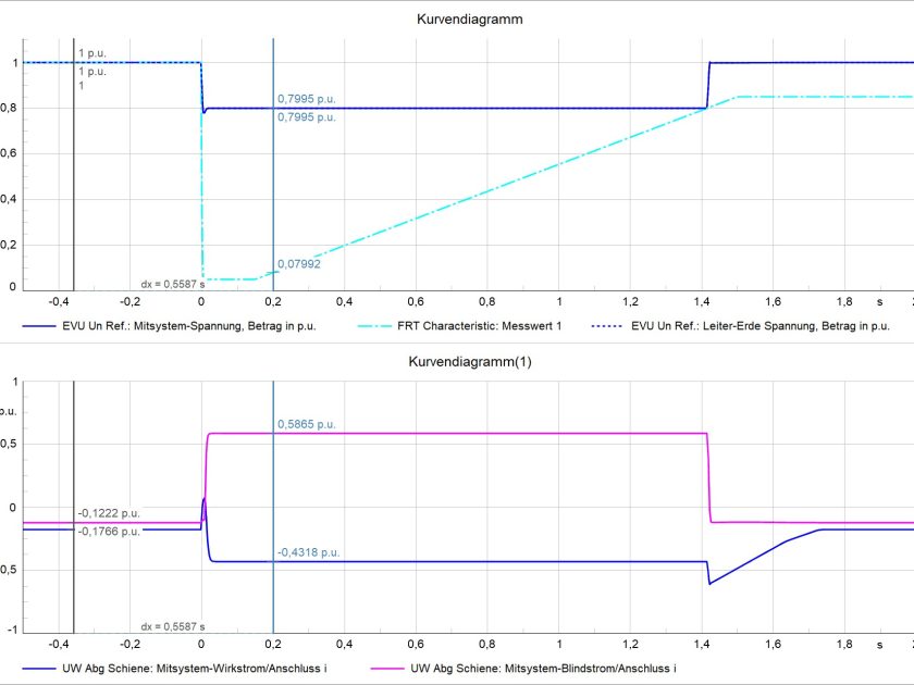 FRT-Simulationen gemäß TOR werden als Konformitätsnachweis an das EVU erstellt um die Einhaltung der TOR-FRT-Vorgabe eines k-Faktors >= 2 nachzuweisen. Die FRT-Simulation ist eine RMS-Simulation, die Ströme, Spannungen und Leistungen entlang einer Zeitachse darstellt.Die Simulation berücksichtigt alle Leistungs- und Strom-Regelkreise der Erzeugungseinheiten wie Generator oder Wechselrichter sowie Gesamtanlagenregler cos-phi-Regler (Anlagenregler) ...