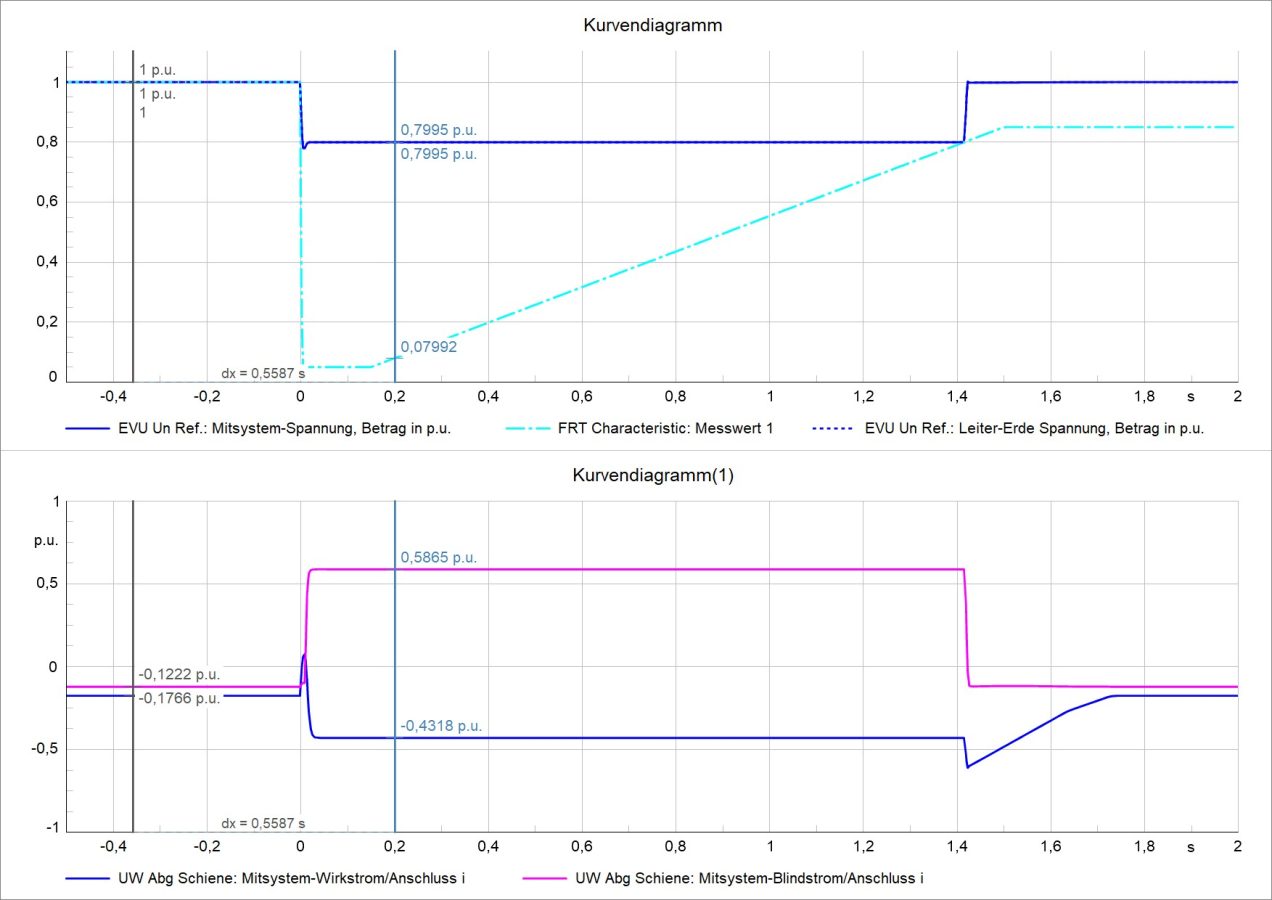 FRT-Simulationen gemäß TOR werden als Konformitätsnachweis an das EVU erstellt um die Einhaltung der TOR-FRT-Vorgabe eines k-Faktors >= 2 nachzuweisen. Die FRT-Simulation ist eine RMS-Simulation, die Ströme, Spannungen und Leistungen entlang einer Zeitachse darstellt.